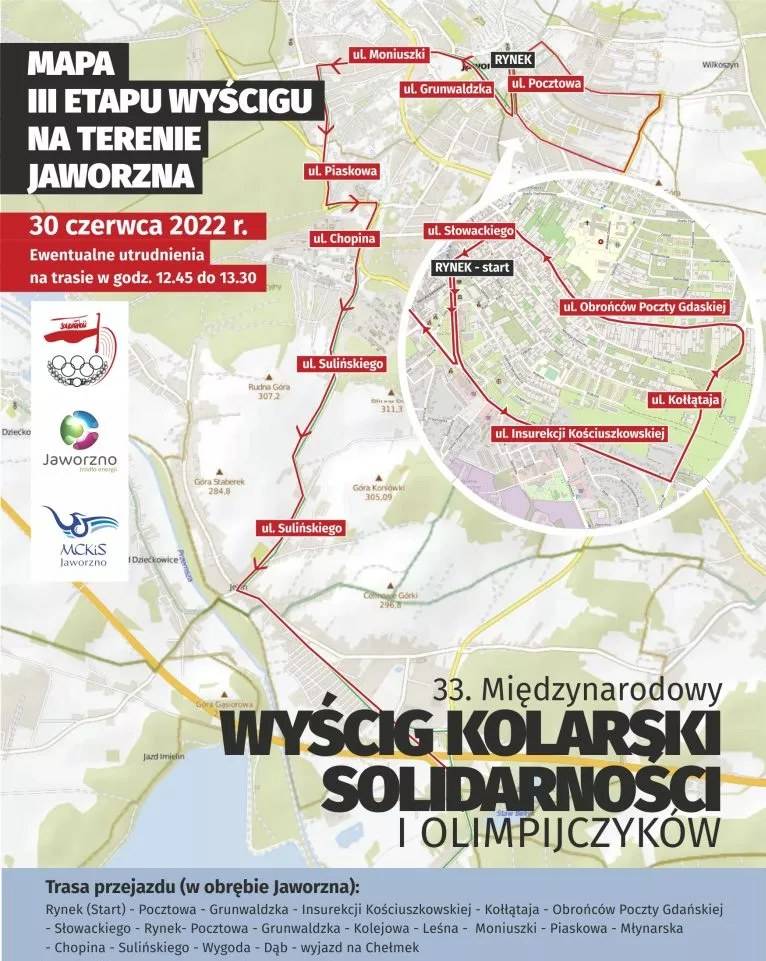 Jaworznicki etap rozpocznie się około godziny 13, kolarze przejadą ul. Grunwaldzką, Insurekcji Kościuszkowskiej, Kołłątaja, Obrońców Poczty Gdańskiej, Słowackiego, przez rynek, a następnie Pocztową i Grunwaldzką pojadą w kierunku ul. Kolejowej, Leśnej, Moniuszki, Piaskowej, Młynarskiej, Chopina, Sulińskiego, Wygoda, Dąb skąd wyjadą drogą na Chełmek.