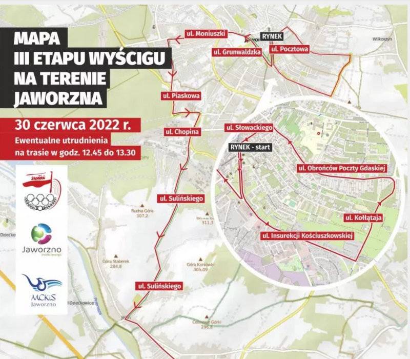 W związku z tym wystąpią utrudnienia w ruchu, z czym muszą się liczyć mieszkańcy Jaworzna. Już od samego rana niedostępne dla kierowców będą ulice Pocztowa, Zielona oraz Narutowicza w godzinach między 6:00 a 14:00. Peleton przejedzie także ulicami: Grunwaldzką, Insurekcji Kościuszkowskiej, Kołłątaja, Obrońców Poczty Gdańskiej, Słowackiego, Pocztową, Kolejową, Leśną, Moniuszki, Piaskową, Młynarską, Chopina, Sulińskiego, Wygoda oraz Dąb. Służby mundurowe będą zabezpieczać trasę wyścigu.