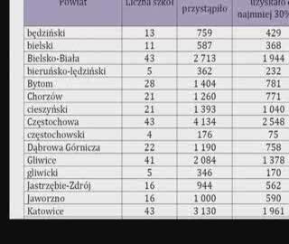 Na Śląsku najgorszą średnią uzyskali uczniowie z powiatu częstochowskiego – zaledwie 42,61% z nich zdało egzamin. Najlepiej wypadł powiat cieszyński, gdzie zdawalność wyniosła aż 74,66%.