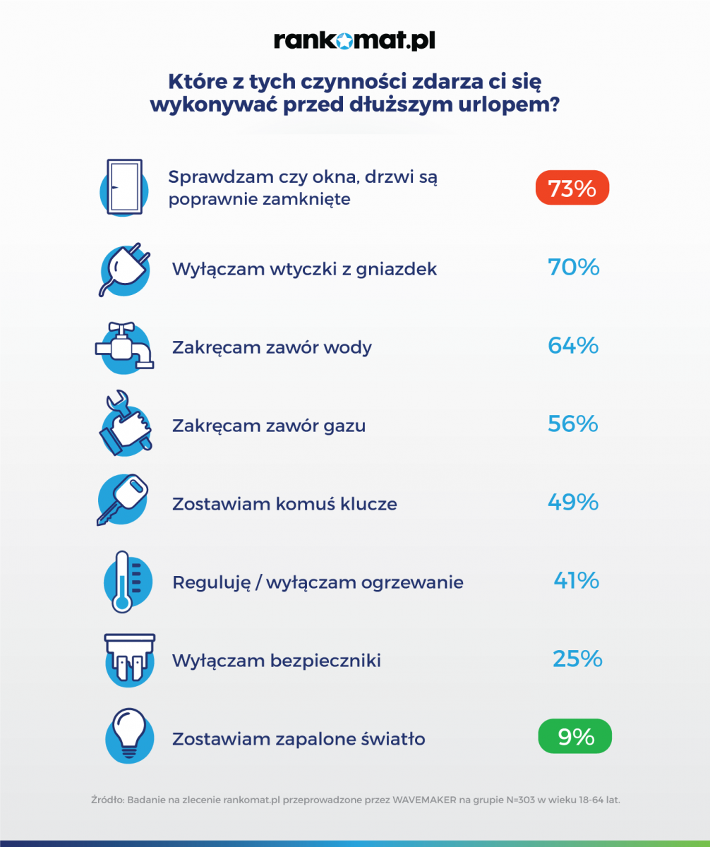 Dane pochodzą z badania “Bezpieczeństwo w domu”, które zostało przeprowadzone na zlecenie rankomat.pl przez WAVEMAKER na grupie N=303 w wieku 18-64 lat.Jeśli jeszcze tego nie zrobiłeś koniecznie zainstaluj naszą aplikację, która dostępna jest na telefony z systemem Android i iOS.