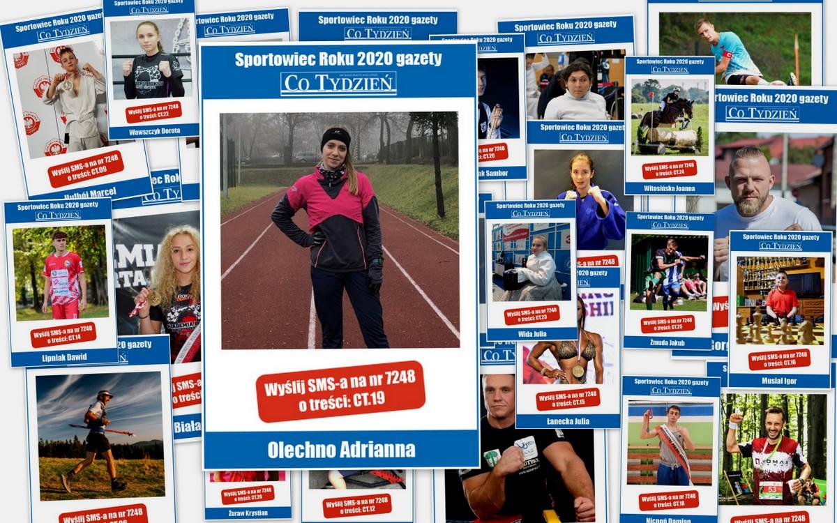 Jeśli chcesz, żeby Adrianna Olechno została Najpopularniejszym Sportowcem Roku 2020 w Jaworznie, wyślij SMS na nr 7248 o treści CT.19 lub wypełnij prawidłowo kupon, dołączany do gazety Co Tydzień i dostarcz go do redakcji. Głosujemy do 6 kwietnia.
