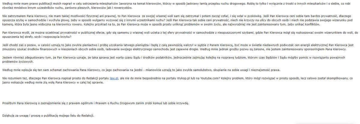 Jednak rowerzysta uważa, że — ma prawo publikacji swoich nagrań w celu ostrzeżenia mieszkańców Jaworzna na temat kierowców, którzy w sposób jawny łamią przepisu ruchu drogowego i dodaję — że robi to tylko i wyłącznie z troski o innych mieszkańców i o siebie, co robi również mnóstwo innym uczestników ruchu, zarówno pieszych, kierowców, jak i rowerzystów.