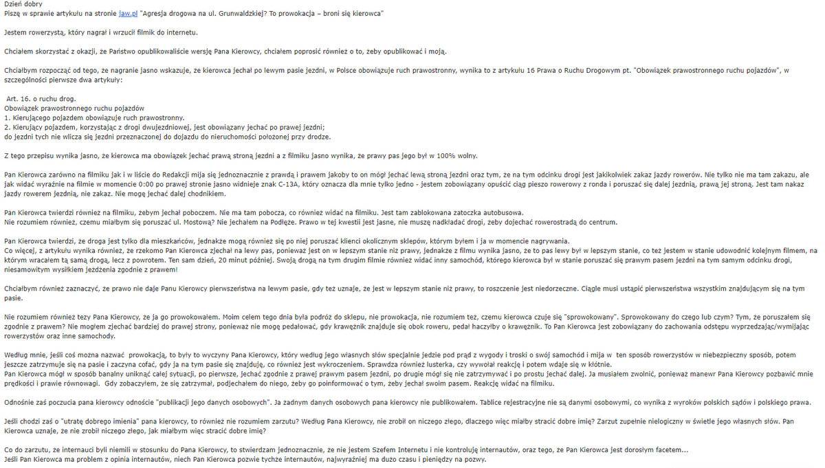 Rowerzysta zadaję także pytanie, dlaczego kontynuacja ich rozmowy prowadzona jest za pośrednictwem naszego portalu. Autor nagrania uważa, że prościej byłoby skontaktować się z nim bezpośrednio na portalu Wykop.pl lub YouTube.com