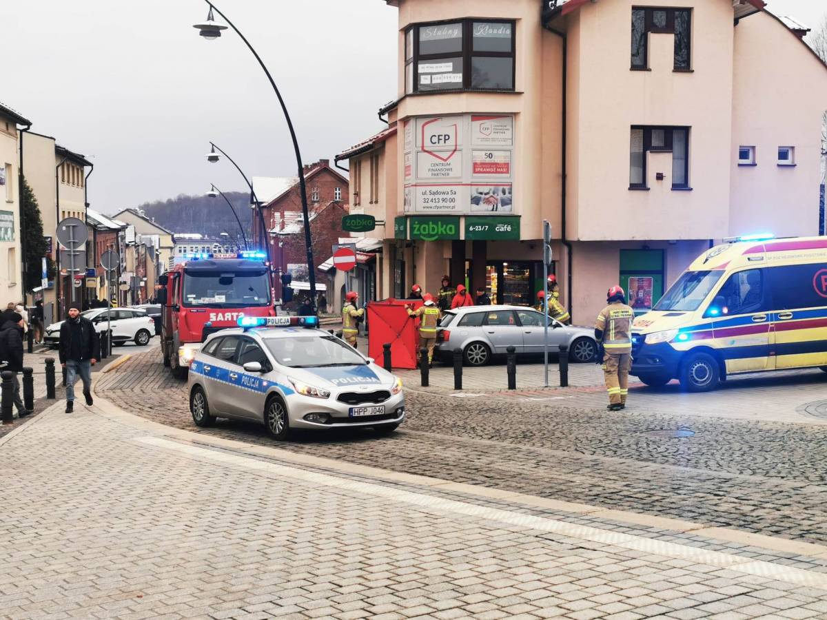 Zasłabniecie w okolicach rynku w centrum Jaworzna. Służby prowadziły akcję reanimacyjną. Po poszkodowanego przyleciał LPR.