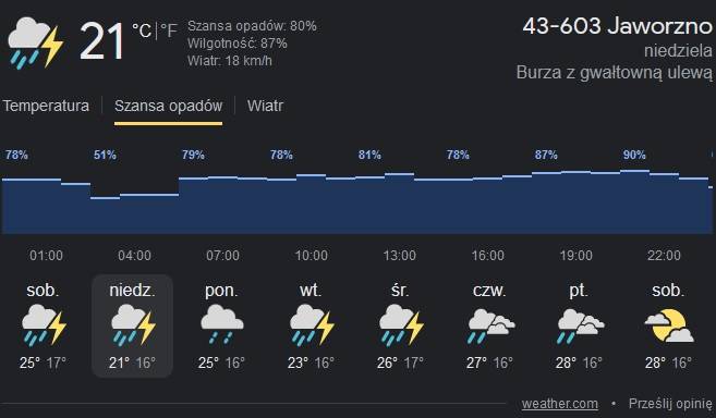 Alert RCB ostrzega przed burzami i silnym wiatrem, które mogą wystąpić w Jaworznie 20 i 21 sierpnia.