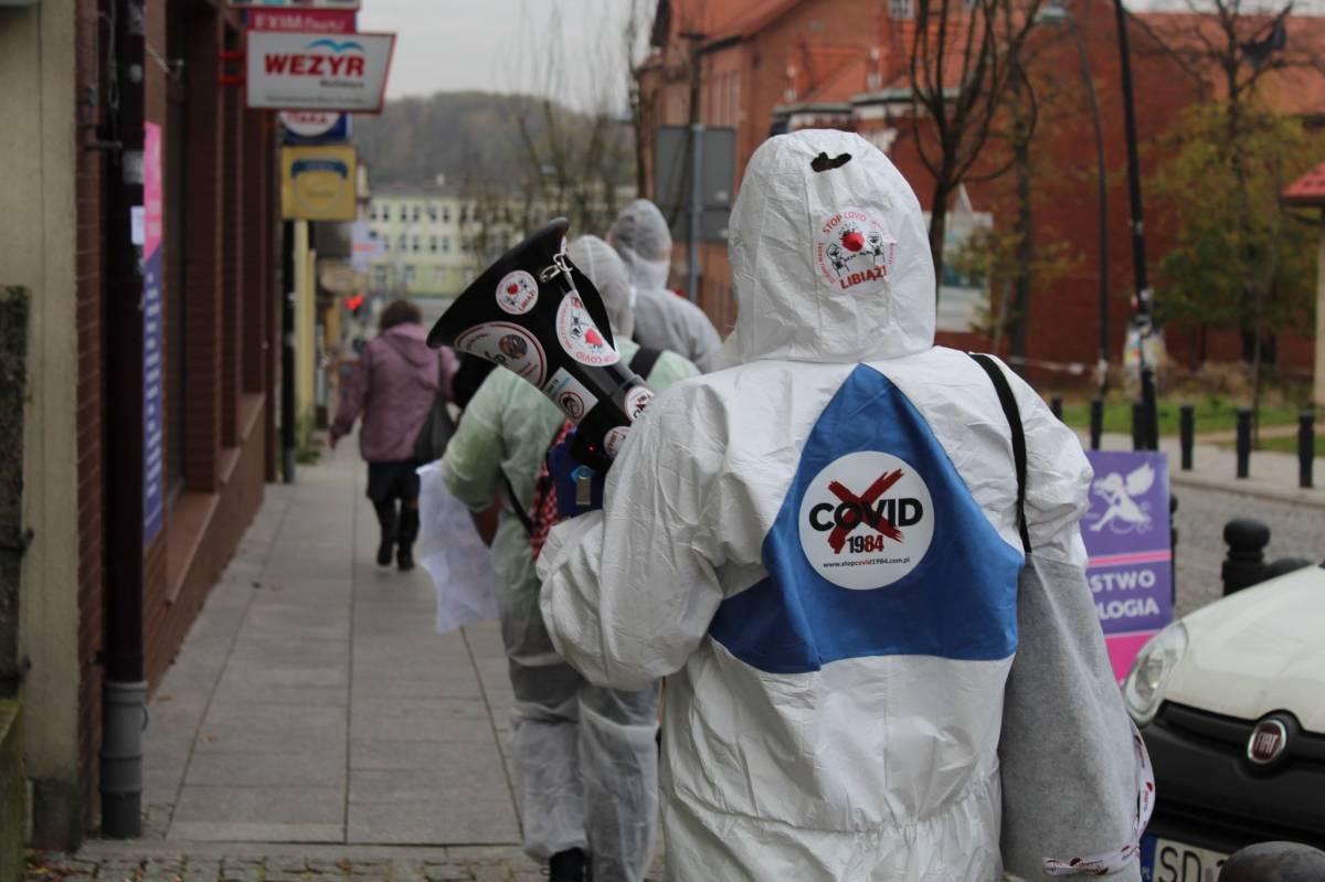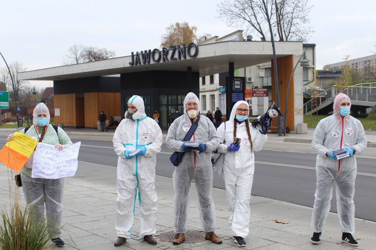 Na ulicach Jaworzna grupa osób w kombinezonach prowadziła happening. Rozdawano ulotki i sprzeciwiano się przymusowym szczepieniom na COVID-19.