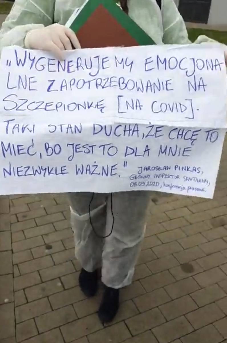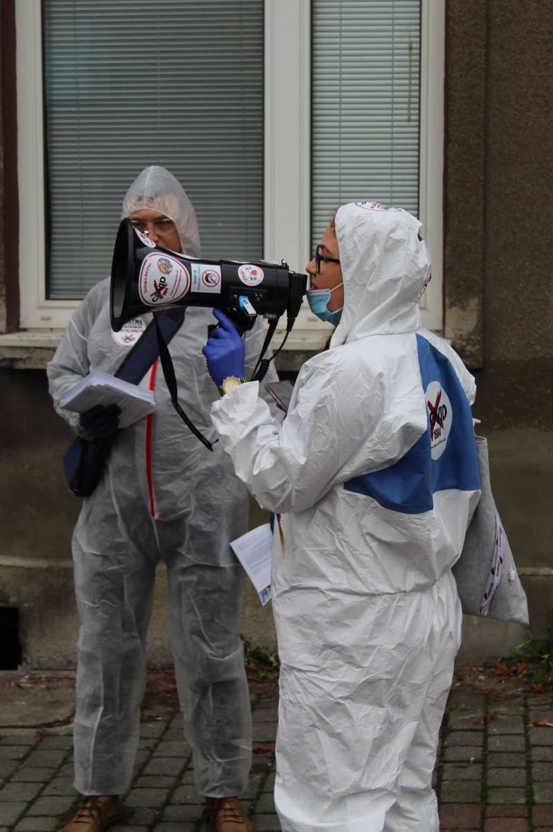 W sobotę na ulicach Jaworzna grupa osób w kombinezonach prowadziła happening. Rozdawano ulotki informujące o przeznaczeniu testów PCR i sposobach wzmacniania naturalnej odporności. Codzienny kontakt z najbliższymi, rezygnacja z fałszywej, medialnej propagandy strachu, koniec z przymusową kwarantanną dla zdrowych ludzi – to ważne kroki do zakończenia pandemii. Pełną listę postulatów, które poparło ok. 200 lekarzy i pracowników służby zdrowia, a także ponad 18 tysięcy obywateli, można odnaleźć pod adresem: www.listlekarzy.pl – fragmenty listu otwartego cytowały rozdawane ulotki. Organizatorzy happeningu odtwarzali przechodniom wypowiedzi polityków, które przeszły do historii... obłudy, otaczającej walkę z pandemią: oto były minister zdrowia Szumowski wyśmiewający noszenie masek, które „nie pomagają, nie zabezpieczają przed wirusem, nie zabezpieczają przed zachorowaniem”, a także premier Morawiecki, zapewniający, że „cała ta choroba jest taka jak inne, jest wiele różnych chorób i nie będziemy się ich bali na zapas” – zamiast tego pójdźmy tłumnie na wybory, wszyscy, a szczególnie seniorzy! Kilkukrotnie przemawiano do jaworznian poprzez megafon oraz prezentowano im transparenty z zapowiedzią przymusu szczepień na COVID-19. Jak podkreślali aktywiści, artykuł 39 Konstytucji RP gwarantuje nam wolność od eksperymentów medycznych, jednak od marca bieżącego roku szereg praw człowieka jest łamanych (prawo do pracy, edukacji, opieki medycznej, swobodnego przemieszczania się, zgromadzeń, nietykalności cielesnej, azylu domowego czy do aresztu, nakładanego wyrokiem sądowym – po przewinieniu, oskarżeniu i uczciwym procesie, a nie za pośrednictwem jedynie telefonicznej nominacji z sanepidu). W czwartek premier RP stwierdził, że „szczepionka przeciwko koronawirusowi dostępna będzie dla każdego na zasadzie dobrowolności”, tymczasem już dzień później minister zdrowia Adam Niedzielski obwieścił, iż rząd „planuje zaszczepić całą populację dorosłych, czyli 31 milionów ludzi”. Jak można zatem uwierzyć choćby w jedno słowo przedstawicieli tego rządu? – pytają retorycznie aktywiści. „Obudźcie się, bo inaczej już za kilka miesięcy nie będziecie mieli za co żyć” – apelowali do przechodniów.