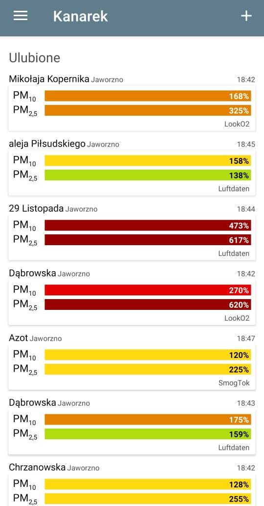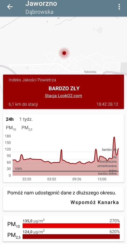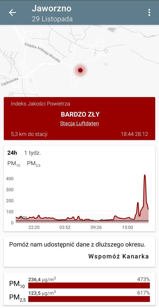 Kanarek to bezpłatna aplikacja, dzięki które można sprawdzić jakość powietrza w interesującej nas okolicy. W Jaworznie znajduje się kilka prywatnych czujników, z których możemy odczytać jakość powietrza w mieście. Ta jest dziś zatrważająca - wg odczytów, poziom pyłu zawieszonego PM10 wynosi ponad 400 proc. normy, a PM2,5 - ponad 600 proc.