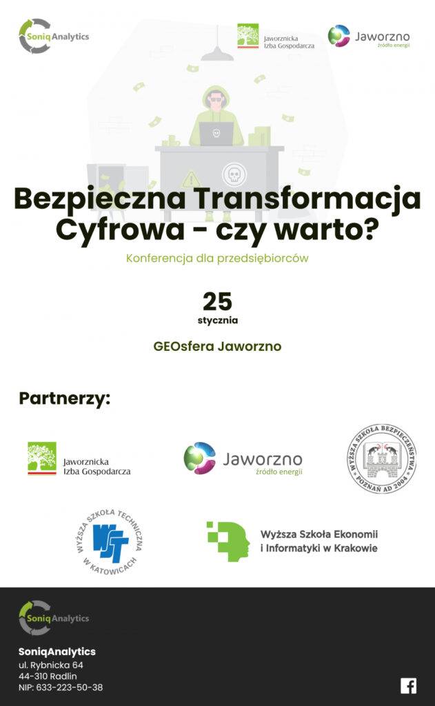 SoniqAnalytics, Gmina Miasta Jaworzna oraz Jaworznicka Izba Gospodarcza zapraszają do wzięcia udziału w konferencji Bezpieczna Transformacja Cyfrowa – czy warto?, która odbędzie od 25 do 28 stycznia br. w Ośrodku Edukacji Ekologiczno-Geologicznej w Jaworznie.