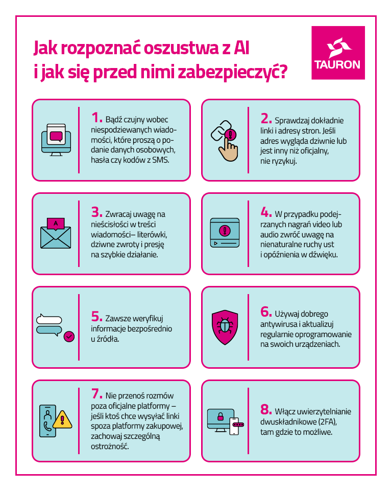 Już ponad 12 milionów razy klienci TAURONA skorzystali w tym roku z serwisów samoobsługowych spółki. Firma konsekwentnie rozwija swoje cyfrowe kanały kontaktu z klientami i stawia na najwyższe standardy bezpieczeństwa technologicznego. Ruszyła też kolejna odsłona działań edukacyjnych, których celem jest wspieranie użytkowników w bezpiecznym poruszaniu się po sieci — zwłaszcza w czasach, gdy zagrożenia cybernetyczne coraz częściej wykorzystują sztuczną inteligencję. W ramach kampanii TAURON publikuje materiały wideo i zachęca do pobrania praktycznego e-booka „Klikaj bezpiecznie”.