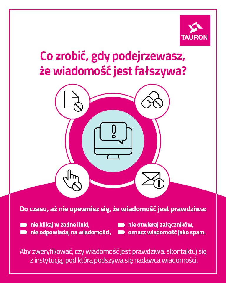 Specjaliści TAURONA przypominają, że największym sprzymierzeńcem bezpieczeństwa w sieci jest zdrowy rozsądek. Cyberprzestępcy często działają tak, by wzbudzić emocje i wymusić natychmiastową reakcję. Dlatego warto zachować spokój i dokładnie sprawdzać każdą wiadomość.