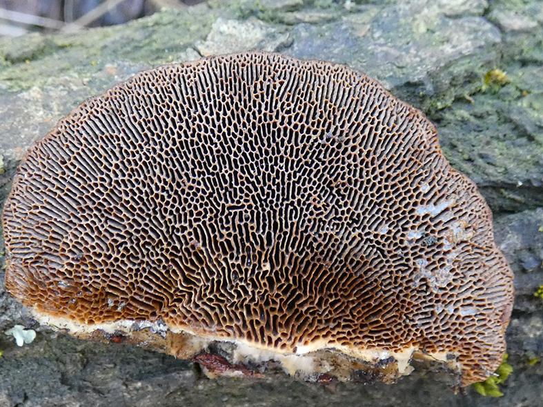 W tej okolicy biegnie bardzo wygodny trakt, który między innymi można przemierzać rowerem. Jeśli jednak nam się nie spieszy, możemy pochylić się nad tym czy owym. Teraz trafiły nam się huba oraz kilka porostów. Hubą jest gmatwica chropowata tworząca jednoroczne przyrośnięte bokiem do żywiciela owocniki. Zawsze na swoich żywicieli wybiera drzewa liściaste. Owocnik jest z wierzchu bardzo płaski ze słabo zaznaczonymi koncentrycznie pierścieniami. Spodem znajduje się labiryntowata warstwa rodzajna, czyli hymenofor. To ani rurki, ani blaszki tylko coś pośredniego. Z porostów trafiły się gatunki naziemne z rodzaju chrobotek o kieliszkowatych oraz rożkowatych podecjach. Na drzewach lokalną dominantą jest często spotykana w Jaworznie tarczownica bruzdkowana. Towarzyszył jej szarozielony obrost drobny oraz jaskrawożółty złotorost ścienny.