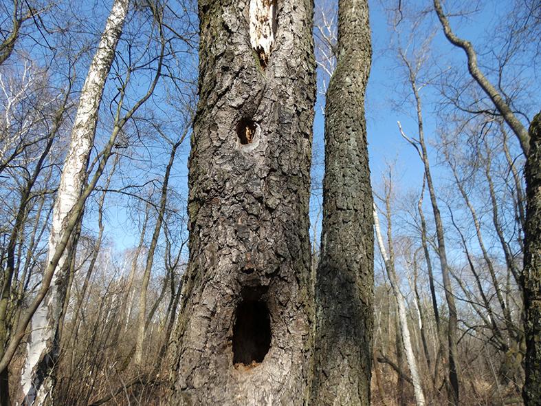Zanim doszliśmy do właściwego punktu startu, zauważyliśmy, że tym razem Kozi Bród tutaj płynie. Poza tym natrafiliśmy na fenologiczną oznakę nadchodzącego przedwiośnia pod postacią pylącej leszczyny. Na krzewie były również widoczne słupki kwiatów żeńskich. Lewy brzeg Białej Przemszy na znacznej długości jest stromy. To wrażenie potęguje mniejszy poziom wody po tym, jak utraciła ona swoje wielkie dolewki, w tym z Sztoły. Blisko rzeki z drzew dominują olsze czarne. Pojawiają się jesion wyniosły, klon zwyczajny oraz czeremcha zwyczajna. Na mniej lub bardziej rozległych równinach dominują sosny zwyczajne. Pomiędzy nimi trafiają się brzozy brodawkowate, topole osiki, dęby czerwone oraz czeremcha amerykańska. Rzeka w tej okolicy usiłuje podmywać brzeg, ale istniejący drzewostan jej to utrudnia. Z kolei na prawym brzegu kształtują się spore łany trzciny pospolitej. Idąc, zauważyliśmy martwą olszę czarną z kilkoma dziuplami. Dziuple musiały być wykute przez dzięcioły, kiedy drzewo żyło. Świadczą o tym ich zagojone brzegi. Naszą uwagę przykuła również trzmielina zwyczajna, której pędy ogryzły jakieś jeleniowate. Poza tym ślady aktywności bobrów w porównaniu do roku 2012 są znikome.