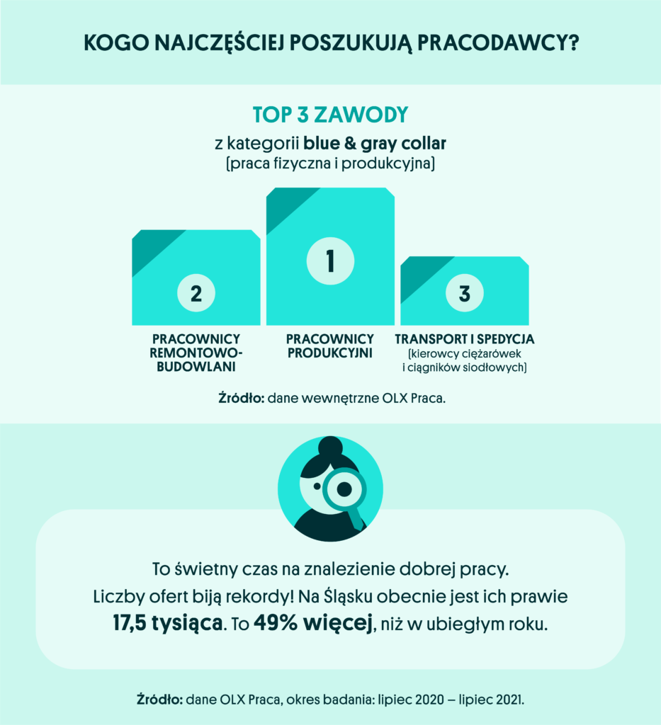 Na Śląsku najbardziej poszukiwanymi obecnie fachowcami (pośród zawodów fizycznych) są pracownicy produkcyjni. W serwisie OLX Praca w lipcu tego roku liczba aktywnych ofert dotyczących tej branży wyniosła blisko 4 tys. W naszym regionie brakuje także fachowców remontowo-budowlanych (3,8 tys. ofert). Na trzecim miejscu wśród deficytowych zawodów są natomiast pracownicy z sektora transport i spedycja (głównie kierowcy samochodów ciężarowych i ciągników siodłowych) – to do nich adresowanych jest 21,7 proc. ofert.