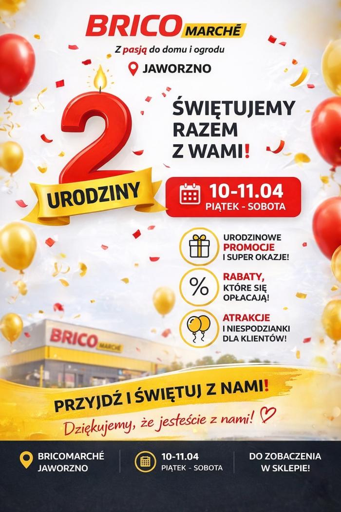 Bricomarché w Jaworznie obchodzi właśnie swój drugi rok działalności. Z okazji tego jubileuszu sklep przygotował wydarzenie, które stawia przede wszystkim na korzyści dla kupujących. Urodzinowe obchody rozpoczynają się dzisiaj, w piątek 10 kwietnia i potrwają do jutra, oferując mieszkańcom miasta szansę na uzupełnienie domowych i ogrodowych zapasów na bardzo korzystnych warunkach.