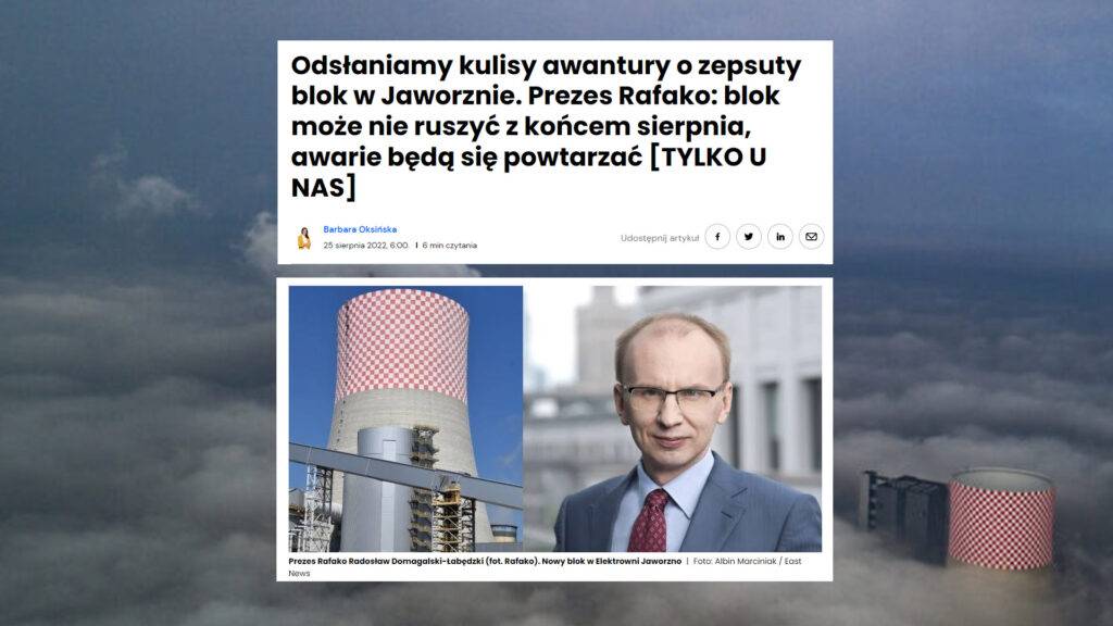 W tekście Barbary Oksińskiej opublikowanym na łamach Busines Insider możemy przeczytać o problemach z uruchomieniem bliku 910 MW w Jaworznie. Autorka cytuje prezesa Rafako, który w mocnych słowach atakuje Tauron.