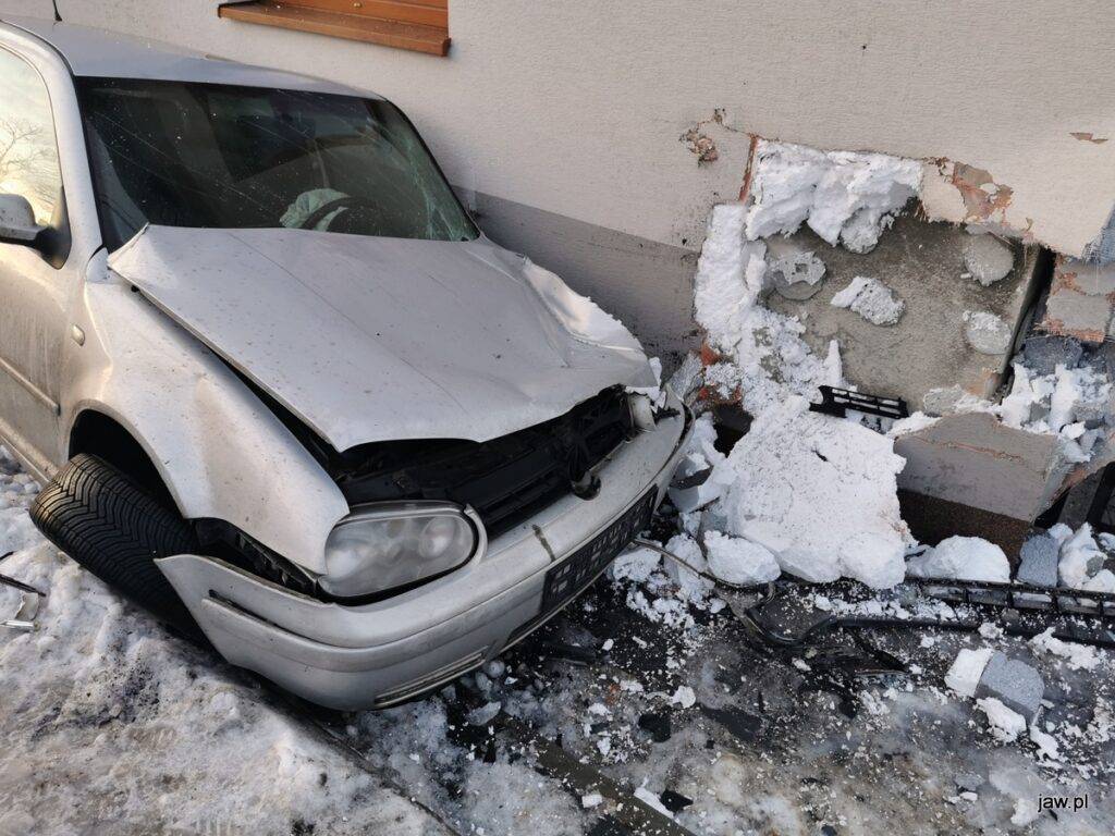 Kierujący pojazdem mając jeden promil alkoholu, nie dostosował prędkości do warunków atmosferycznych panujących na drodze, w wyniku czego uderzył w budynek mieszkalny, uszkadzając samochód, elewacje budynku i barierkę. Kierowcy na szczęście nic się nie stało. Został on zatrzymany.