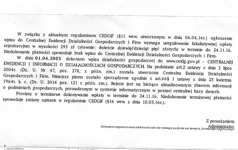 Centralna Ewidencja Działalności Gospodarczych i Firm to kolejny twór, przed którym ostrzega Ministerstwo Rozwoju. W rozmowie telefonicznej z nami, dyrektor Departamentu Handlu i Usług - Beata Gorajek podkreśla, że wpisy i zmiany w CEIDG są bezpłatne. W piśmie, który otrzymała m.in. nasza czytelniczka, czytamy, że należy zapłacić "fakultatywną opłatę rejestracyjną w wysokości 295 zł".