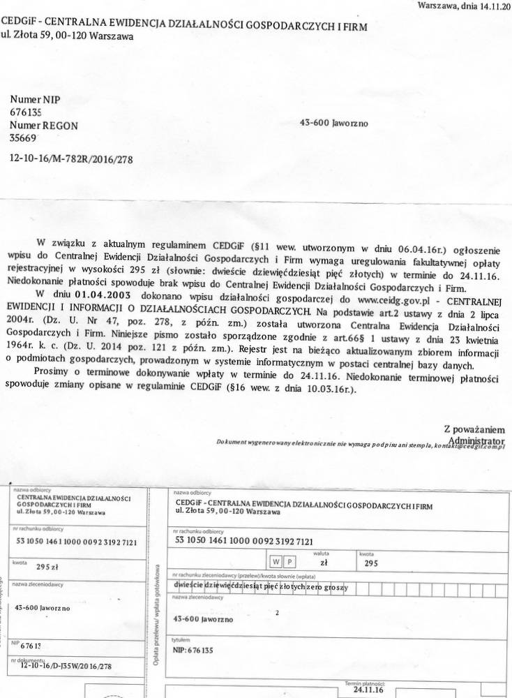 Do skrzynek pocztowych przedsiębiorców z Jaworzna trafiają pisma z Centralnej Ewidencji Działalności Gospodarczych i Firm (CEDGiF), w których przedsiębiorcy informowani są o nowym regulaminie i konieczności wpłaty 295 zł.