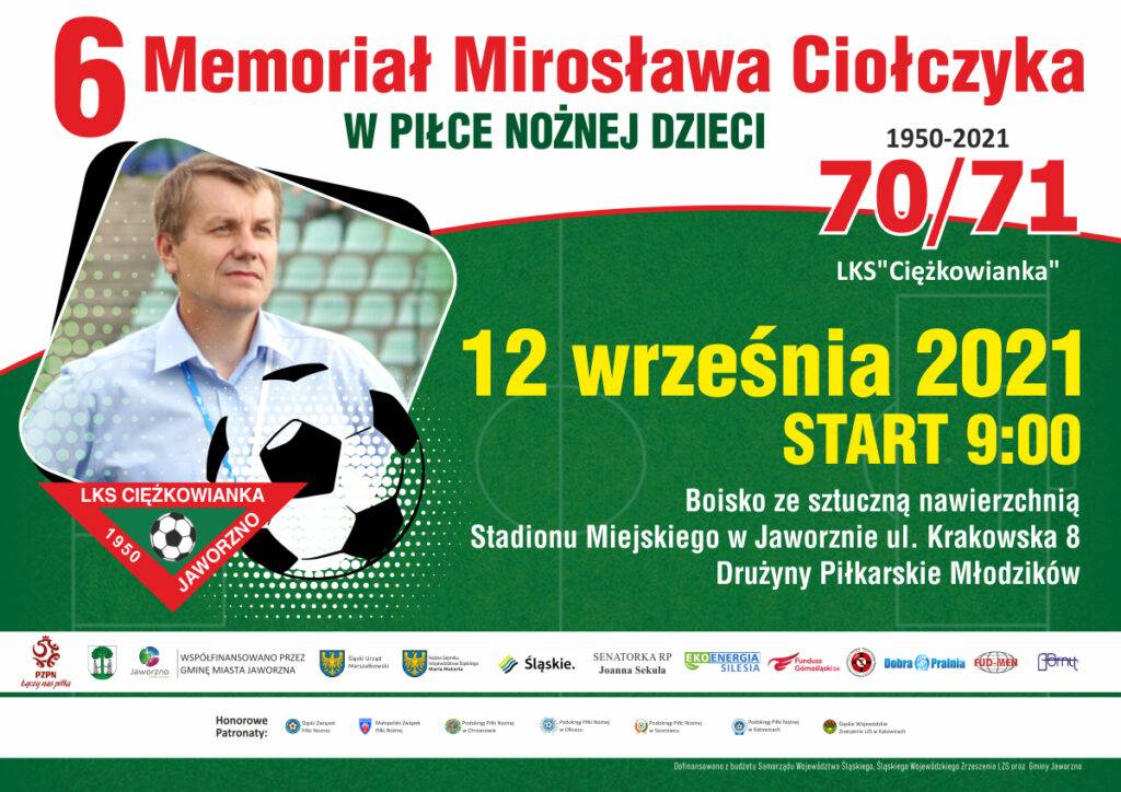 LKS "Ciężkowianka" Jaworzno serdecznie zaprasza na 6. Memoriał Mirosława Ciołczyka w ramach Jubileuszu 70/71 lecia LKS "Ciężkowianka" Jaworzno, 75 lecia Zrzeszenia LZS oraz Narodowego Dnia Sportu, który odbędzie się w niedzielę 12 września 2021 roku na sztucznej nawierzchni Stadionu Miejskiego MCKiS Jaworzno "Victoria" przy ulicy Krakowskiej 8.