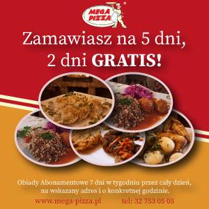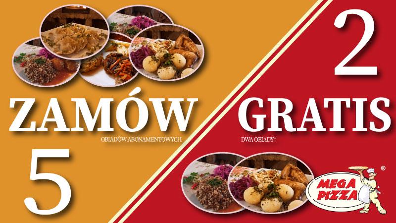 Mega-Pizza wprowadziła zestawy abonamentowe. Dzięki zamówieniu pięciu obiadów możemy skorzystać z wyjątkowej ceny. W porównaniu z ceną pojedynczych obiadów zamawianych z karty to oszczędność aż 40%.