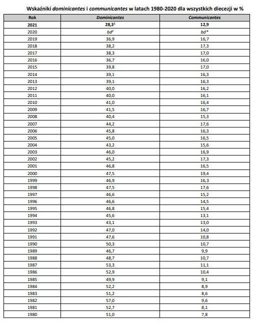 Raport pokazujący statystykę religijności w naszym kraju został opublikowany po rocznej przerwie spowodowanej pandemią i dotyczy roku 2021. Można z niego się dowiedzieć, ile jest osób chodzących na niedzielne msze święte tzw. dominicantes oraz ile jest osób przyjmujących komunię świętą tzw. communicantes. A wszystko w kontekście całego kraju oraz poszczególnych diecezji.