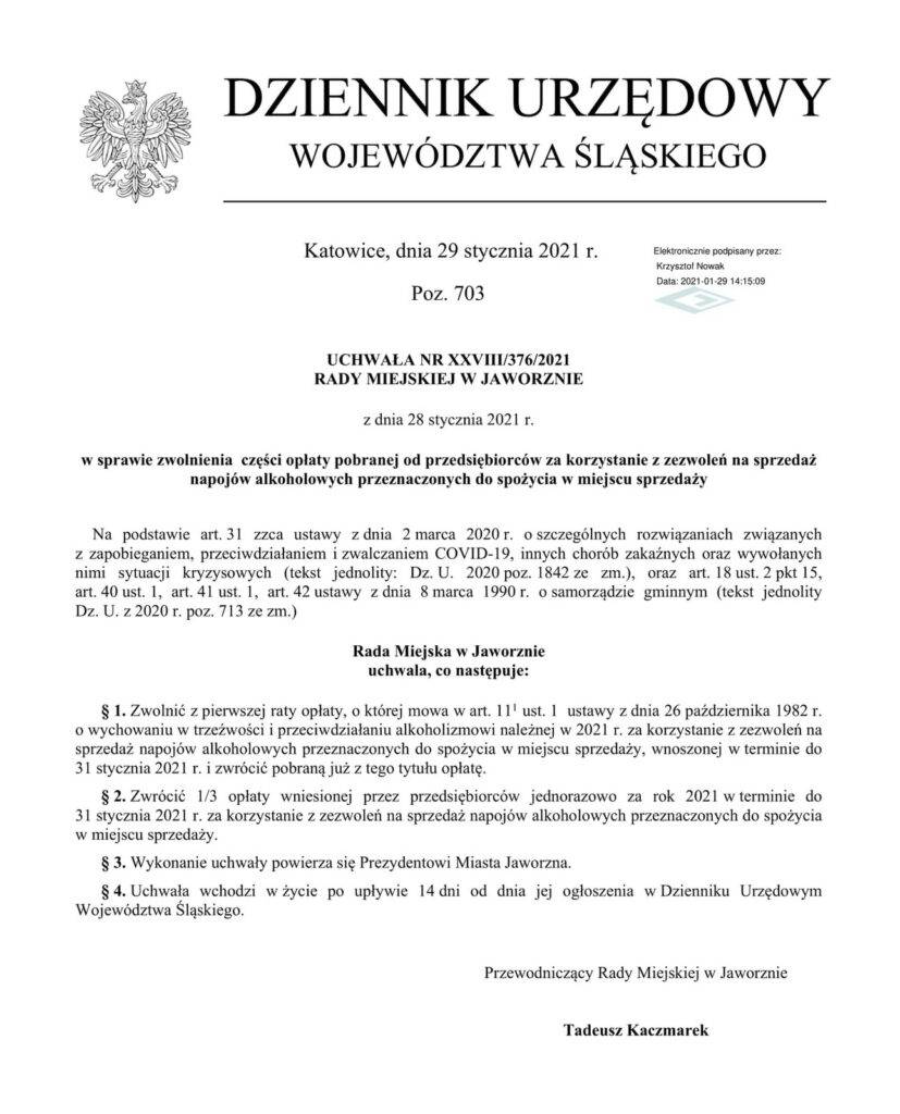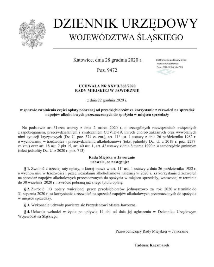Dla przypomnienia dwie uchwały w sprawie zwolnienia części opłaty pobranej od przedsiębiorców za korzystanie z zezwoleń na sprzedaż napojów alkoholowych przeznaczonych do spożycia w miejscu sprzedaży za rok 2020 oraz 2021 nabrały mocy prawnej.