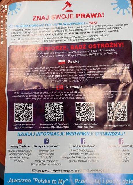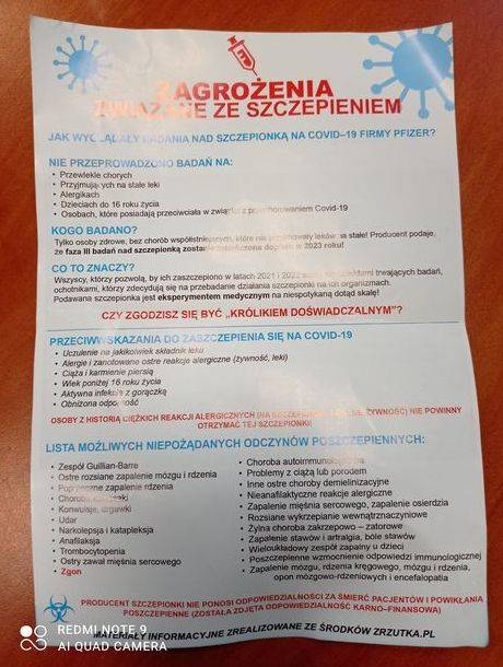 Ulotki, których autorem jest jaworznicki oddział organizacji Polska to my, zawierają ostrzeżenia przed możliwymi negatywnymi skutkami szczepień na COVID-19. Na jednej z nich znajdziemy "pouczenie" odnośnie możliwości odmowy przyjęcia szczepionki, na drugiej - przeciwwskazania co do szczepień i wątpliwością autorów co do rzetelności testów preparatu Pfizera.