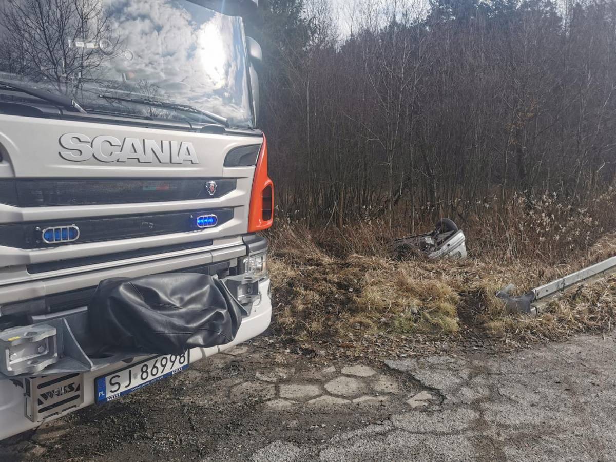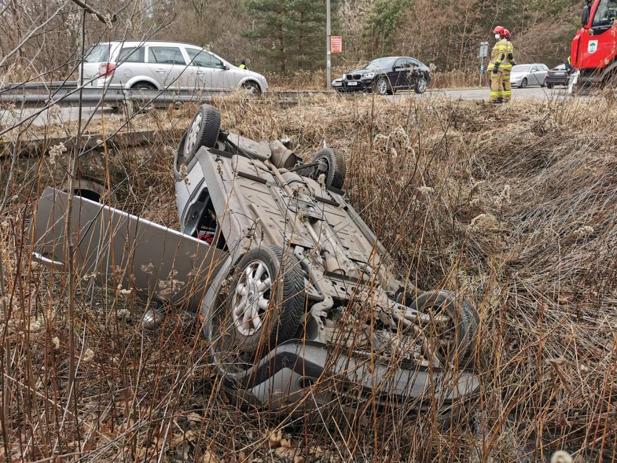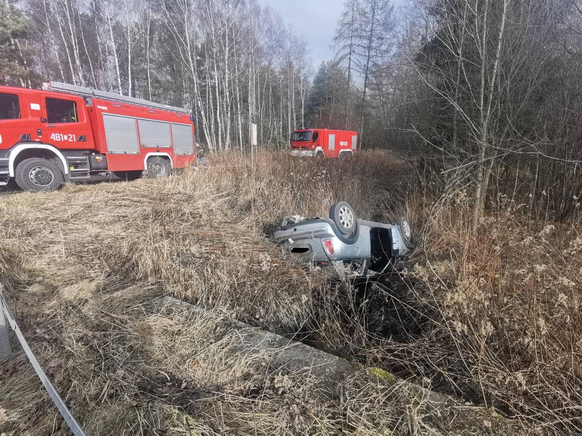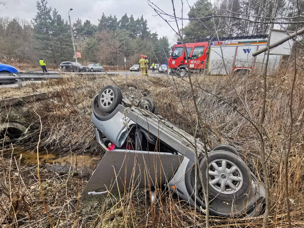 Dachowanie samochodu osobowego w Jaworznie Jeleniu. Droga jest obecnie zablokowana, a na miejscu interweniuje LPR.