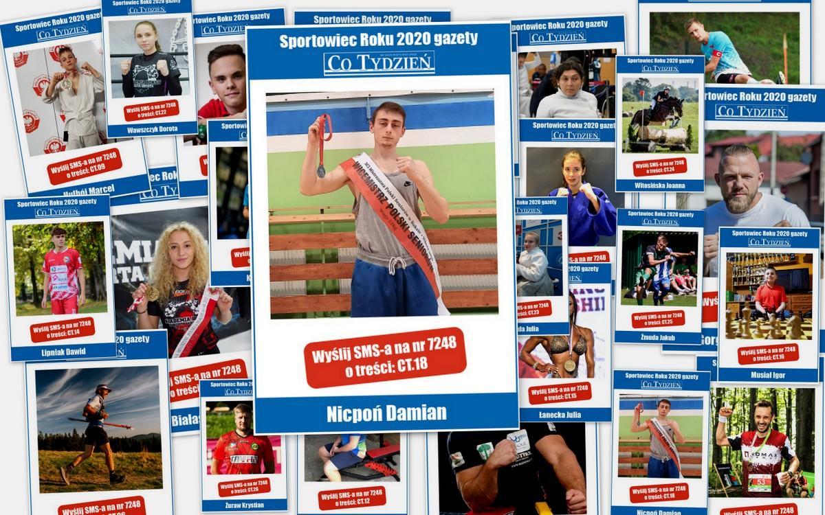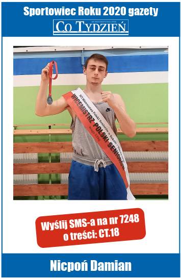 Jeśli chcesz, żeby Damian Nicpoń został Najpopularniejszym Sportowcem Roku 2020 w Jaworznie, wyślij SMS na nr 7248 o treści CT.18 lub wypełnij prawidłowo kupon, dołączany do gazety Co Tydzień i dostarcz go do redakcji. Głosujemy do 6 kwietnia.