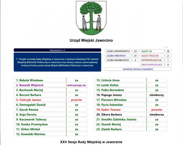 Za uchwałą zagłosowało 18 radnych, przeciw było 2, jedna osoba wstrzymała się od głosu. Jedna z radnych, mimo obecności na sesji, nie oddała głosu (szczegóły głosowania na końcu tekstu). Uchwała o zamiarze liwkidacji filii miejskiej biblioteki Jeziorki, to dopiero pierwszy krok w tym procesie, który może potrwać około pół roku.