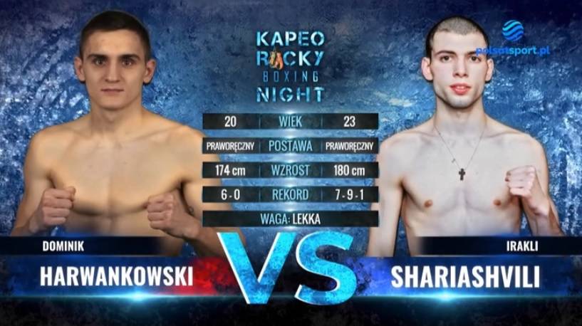 W pojedynku wagi lekkiej, który odbył sie 10 grudnia podczas gali KAPEO Rocky Boxing Night Dominik Harwanowski (7-0) pokonał Irakliego Shariashviliego na punkty, jednogłośną decyzją sędziów (60-54, 60-54, 60-54).
