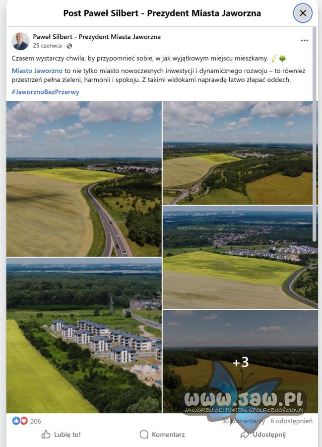 Pod koniec czerwca tego roku w mediach społecznościowych, na oficjalnym profilu prezydenta Jaworzna, Pawła Silberta, zamieszczony został tekst: „Czasami wystarczy chwila, by przypomnieć sobie, w jakim wyjątkowym miejscu mieszkamy. Miasto Jaworzno to nie tylko miasto nowoczesnych inwestycji i dynamicznego rozwoju – to również przestrzeń pełna zieleni, harmonii i spokoju. Z takimi widokami naprawdę łatwo złapać oddech”. Tekst został zilustrowany zdjęciami z powietrza, a ujęcia wykonano w okolicy nowego osiedla Sfera Południe z widokiem na tereny rolnicze i tereny okolic Geosfery. Widać na nich łany zbóż, czy też łąki okwiecone makami.