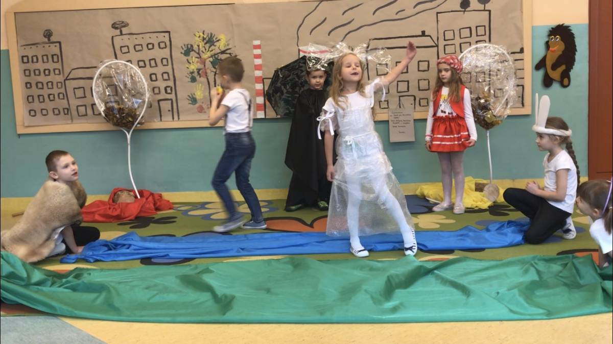 Nieocenionym wsparciem podczas realizacji przedstawienia były konsultacje z panią Elżbietą Gorzką- Kmieć, która dzieliła się z nami swoim doświadczeniem zawodowym w teatrze dziecięcym. Okazało się, że fantastyczną, minimalistyczną dekorację można zrobić z szarego papieru, celofanu, folii bąbelkowej, rur, otulin czy surowców wtórnych.