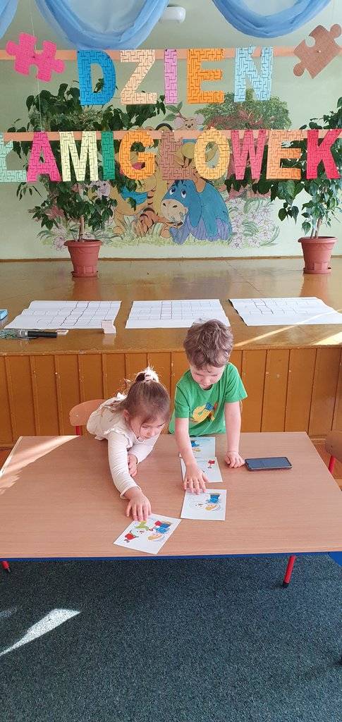 Wspólnie rozwiązywaliśmy krzyżówki oraz wykreślanki. Królowały labirynty, zabawy z tangramem i mnóstwo zagadek, których rozwiązanie było nie lada wyzwaniem. Dzieci wytężały swoje szare komórki, by prawidłowo i w jaki najkrótszym czasie rozszyfrować każdą łamigłówkę. Wszystkie przedszkolaki – maluchy i starszaki, doskonale poradziły sobie z tak różnorodnymi zadaniami. Dzień Łamigłówek przyniósł nam mnóstwo frajdy!!