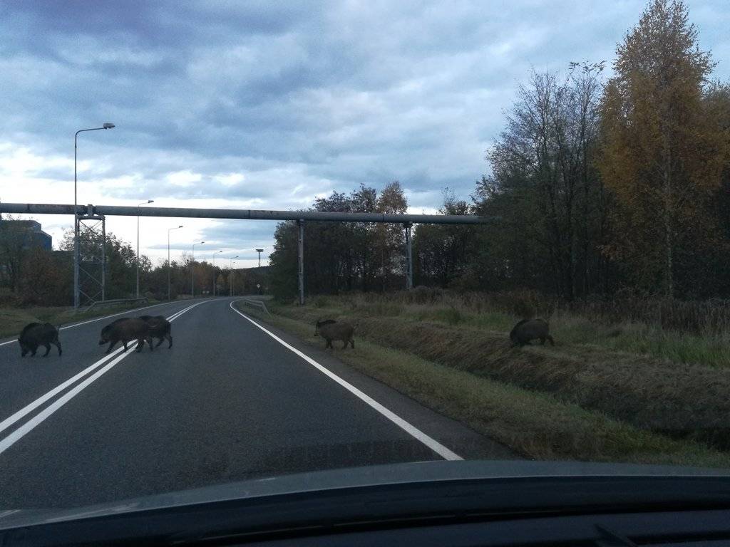 Dziki, być może mając na względzie spieszących się kierowców, sprawnie przeszły przez ulicę, kierowcy mogli kontynuować jazdę.