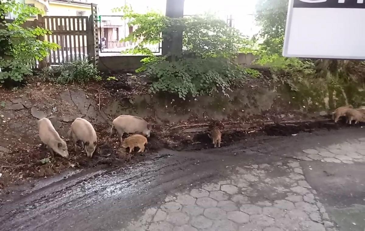 Liczące 10 zwierząt stadko odwiedziło okolice hotelu Brojan w okolicach Pechniku. Coraz bardziej zadomowione w mieście dziki - wielu mogłoby powiedzieć, że nawet zbyt zadomowione - stojących kilka metrów od nich ludzi się nie bały - w spokoju przeszukiwały okoliczne zarośla w poszukiwaniu pożywienia.