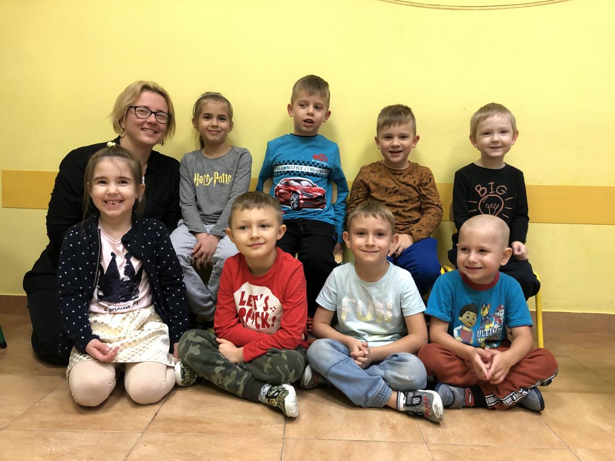 Grupa Biedroneczki z panią Magdaleną Bywalec, od lewej rząd górny: Maja Lachowicz, Kamil Słopiecki, Wojtek Kurp, Kamil Majcherczyk, rząd dolny od lewej: Emilia Wrona, Filip Byrczek, Patryk Żurek, Denis Proniuk.[/caption]