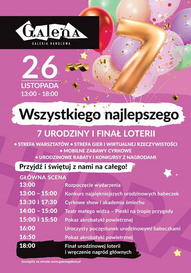 26 listopada to również okazja do świętowania 7. Urodzin Galerii Galena! W godz. 13:00 – 18:00 na Klientów galerii czekać będą liczne atrakcje przygotowane przez galerię tj. strefa warsztatów dla dzieci z malowaniem buziek oraz konkursem na przygotowanie najpiękniejszej babeczki urodzinowej, strefa gier i wirtualnej rzeczywistości, mobilne zabawy oraz sztuczki cyrkowe z balonami i pyszną watą cukrową. Ponadto teatrzyk dla dzieci, pokazy akrobatyczne, cyrkowe show oraz konkursy prowadzone przez Konferansjera z atrakcyjnymi upominkami i nagrodami. Nie zabraknie również ofert specjalnych w wybranych sklepach oraz słodkiego poczęstunku dla Klientów w postaci urodzinowych babeczek!