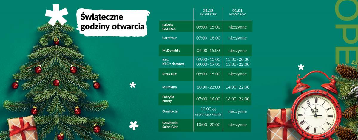 Jak należało się spodziewać, większość sklepów i punktów usługowych w galerii handlowej Galena 1 stycznia będzie nieczynnych - a te czynne zostaną otwarte później niż zazwyczaj. W sylwestra godziny otwarcia będą w różnym stopniu skrócone.