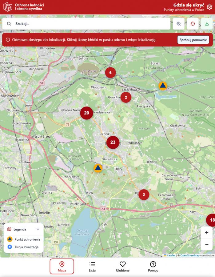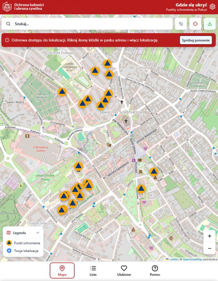Na mapie aplikacji znalazły się również punkty schronienia w Jaworznie. Najwięcej z nich znajduje się w ścisłym centrum miasta. Miejsca schronienia znajdziemy także w rejonie Osiedla Stałego. Pojedyncze punkty są zlokalizowane również na obrzeżach miasta.