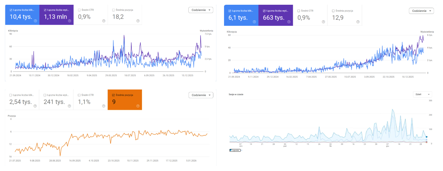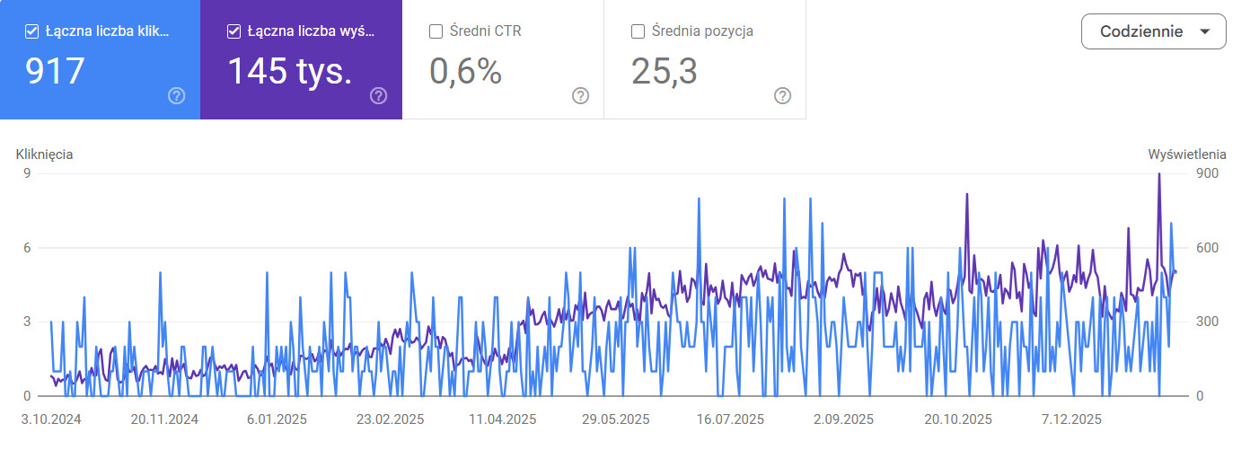 Wzrost wyświetleń często brzmi jak sukces, ale bez kliknięć to bywa tylko „więcej okazji do bycia pominiętym”. Najczęstsze powody są proste - strona pojawia się dalej (np. 12-25 pozycja), title/description nie zachęcają do kliknięcia, albo Google pokazuje Cię na masę luźnych zapytań, które nie pasują do oferty. Dlatego w GSC zawsze patrz na parę: kliknięcia + średnia pozycja + CTR dla konkretnych podstron ofertowych. Jeśli raport mówi „jest progres”, a w GSC podstrony, które mają sprzedawać, stoją w miejscu, to progres jest tylko na slajdzie.