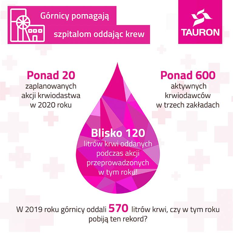 Blisko 120 litrów krwi zebrali już w tym roku górnicy z TAURON Wydobycie – z zakładów Janina, Sobieski, Brzeszcze - w akcjach charytatywnych, odpowiadając tym samym na apel szpitali na Śląsku i w Małopolsce. W tym roku w kopalniach przeprowadzonych zostanie łącznie 21 takich akcji.