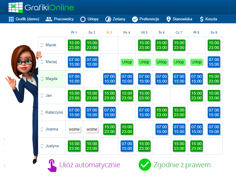 Każda firma to przede wszystkim pracownicy, wykonujący zlecone im obowiązki. Zadaniem każdego właściciela firmy pozostaje więc umiejętne rozdzielenie pracy pomiędzy sw ój personel oraz efektywna kontrola wszystkich aktywności. Aby nie pogubić się w zawiłych formalnościach, warto używać inteligentnych grafików pracy i harmonogramów. Z pomocą przychodzi program Grafikionline.pl, który stanowi połączenie prostego interfejsu, rozbudowanych funkcjonalności oraz możliwości swobodnej personalizacji aplikacji. To właśnie na tych trzech najważniejszych zaletach pragniemy się skupić, przybliżając internetowy program do układania grafików pracy online.