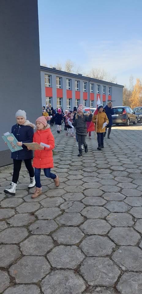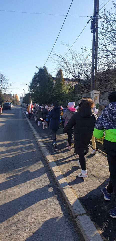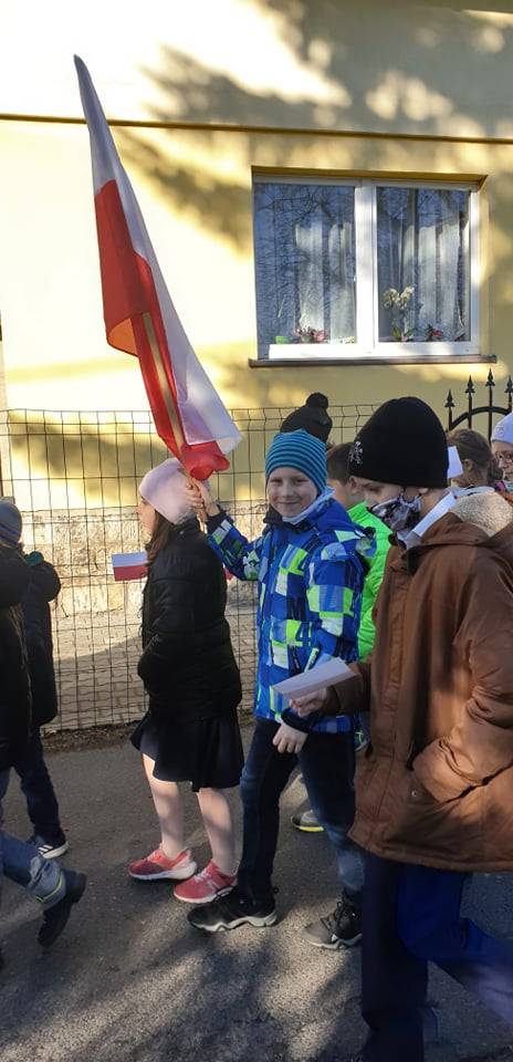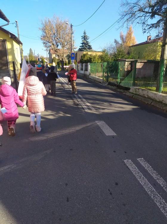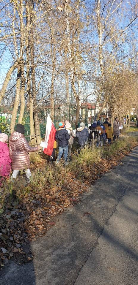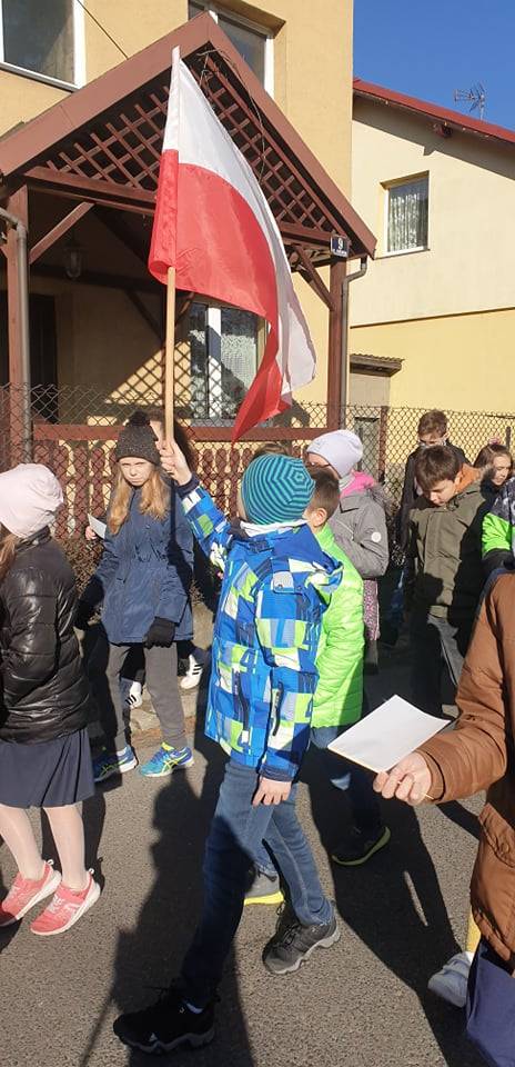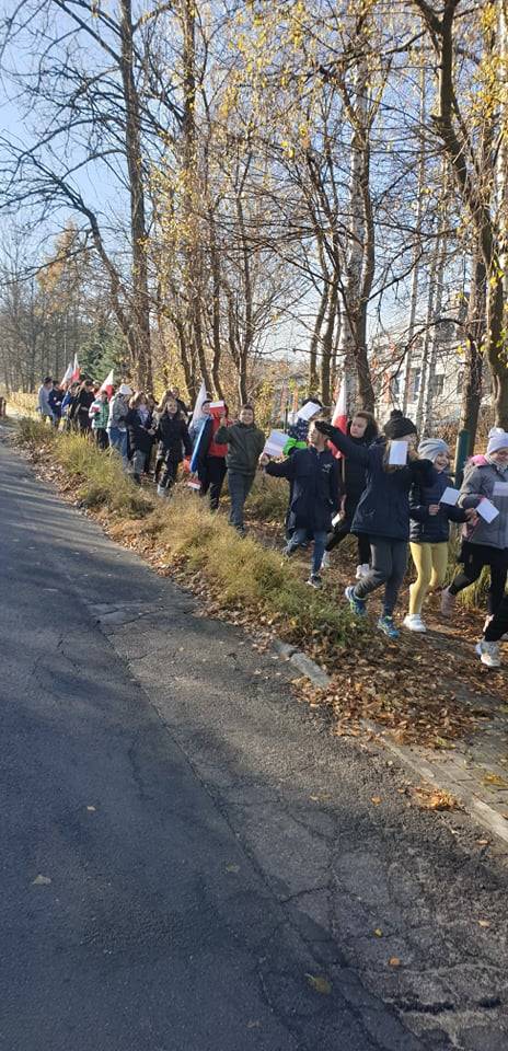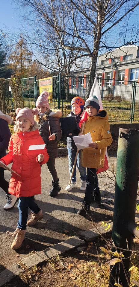 Dnia 10 listopada 2021r. Uczniowie ze Szkoły Podstawowej nr 11 w Jaworznie wraz z nauczycielami wyruszyli ulicami dzielnicy Pieczyska na patriotyczny happening.