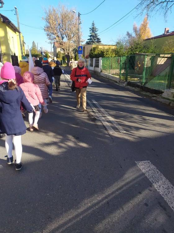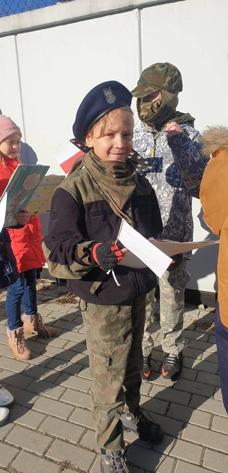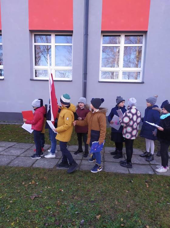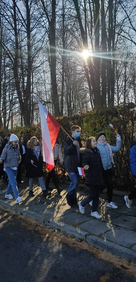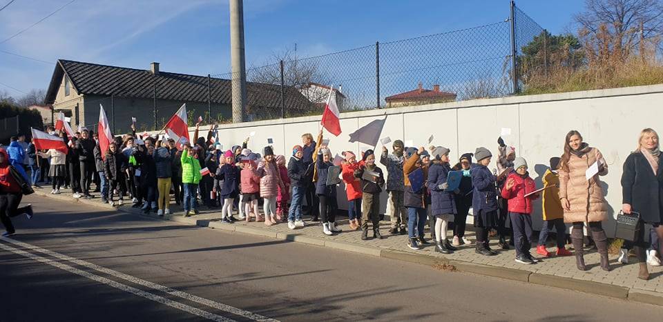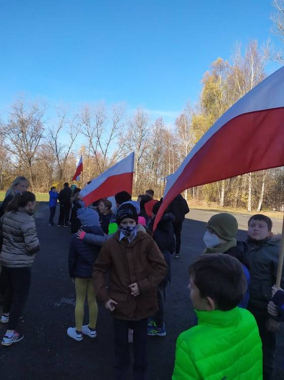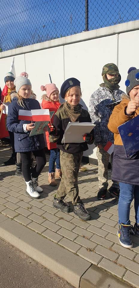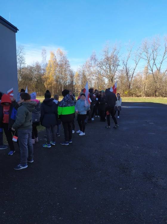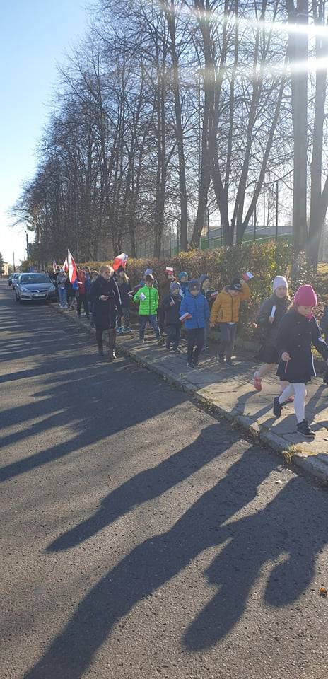 Dnia 10 listopada 2021r. Uczniowie ze Szkoły Podstawowej nr 11 w Jaworznie wraz z nauczycielami wyruszyli ulicami dzielnicy Pieczyska na patriotyczny happening.