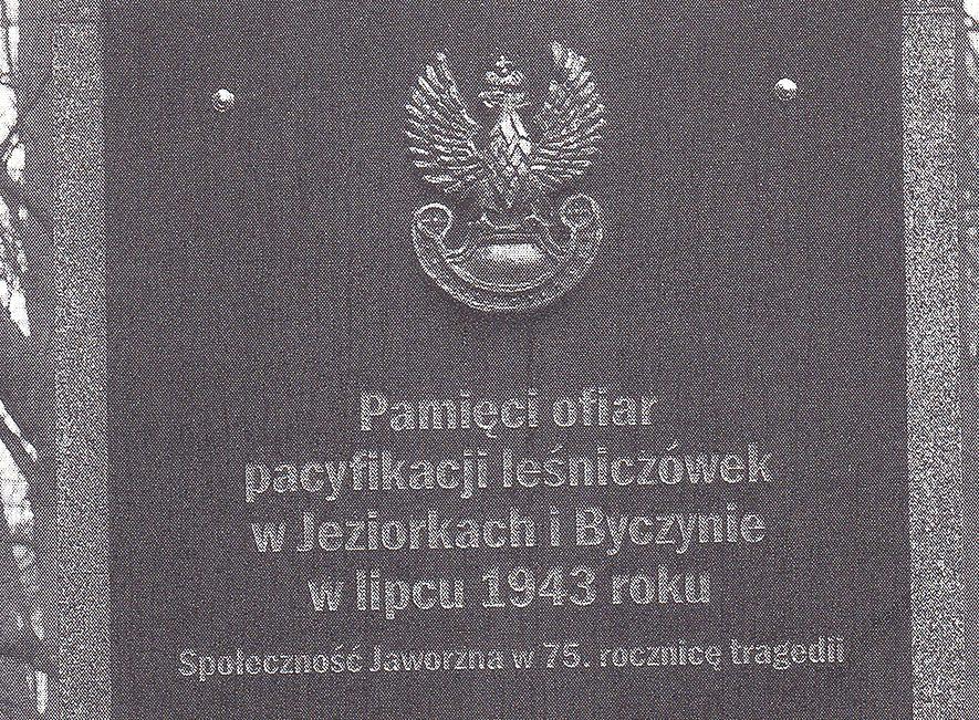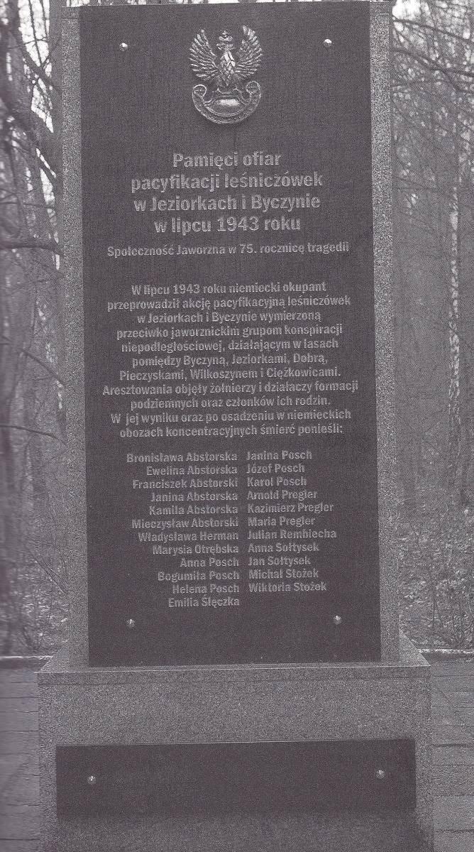 Pomnik, stan z grudnia 2018 r. (fot. Tomasz Gut)[/caption] Ostatecznie w ramach „dekomunizacji” w kwietniu 2018 r. usunięto z pomnika napis AL, tarczę z orłem w szczycie. 29 czerwca tegoż roku usunięto pozostałe napisy i zamontowano nową tablicę informującą, że w lipcu 1943 r. niemiecki okupant przeprowadził akcję pacyfikacji leśniczówek w Jeziorkach i Byczynie, w wyniku której aresztowano żołnierzy i działaczy formacji podziemnych i członków ich rodzin. Na pomniku wyryto również nazwiska 23 osób, które straciły życie w wyniku pacyfikacji lub też zostali pomordowani po zesłaniu do obozów koncentracyjnych.