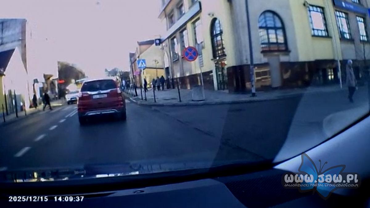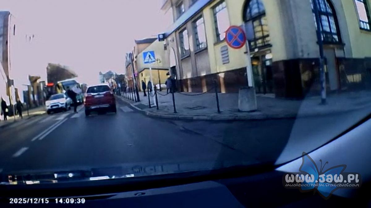 Do tej niebezpiecznej sytuacji doszło na przejściu dla pieszych tuż za skrzyżowaniem z ulicą Mickiewicza, zaraz obok banku oraz sklepu medycznego. Kierowca czerwonej Hondy jechał główną ulicą w centrum miasta od strony galerii w kierunku Urzędu Miejskiego chwile po godzinie 14:00 w poniedziałek, 15 grudnia.