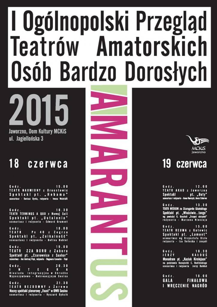 Po raz pierwszy do Jaworzna zawitają amatorskie teatry osób dorosłych z całego kraju. Wszystko w ramach I Ogólnopolskiego Przeglądu Teatrów Amatorskich Osób Bardzo Dorosłych Amarantus. Przez dwa dni – 18 i 19 czerwca Dom Kultury w Szczakowej oraz Sosina przepełnione będą twórczością teatralną. W ramach Przeglądu przewidziano dziewięć spektakli, w tym jeden monodram i jeden nocny spektakl.