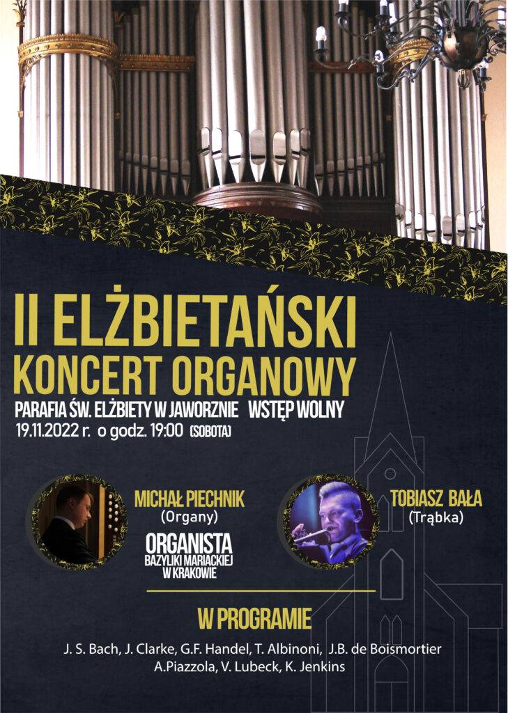 Parafia św. Elżbiety Węgierskiej w Jaworznie ma wielką przyjemność zaprosić wszystkich parafian i gości na II Elżbietański koncert organowy, który odbędzie się z okazji odpustu parafialnego w sobotę 19 listopada o godzinie 19:00.